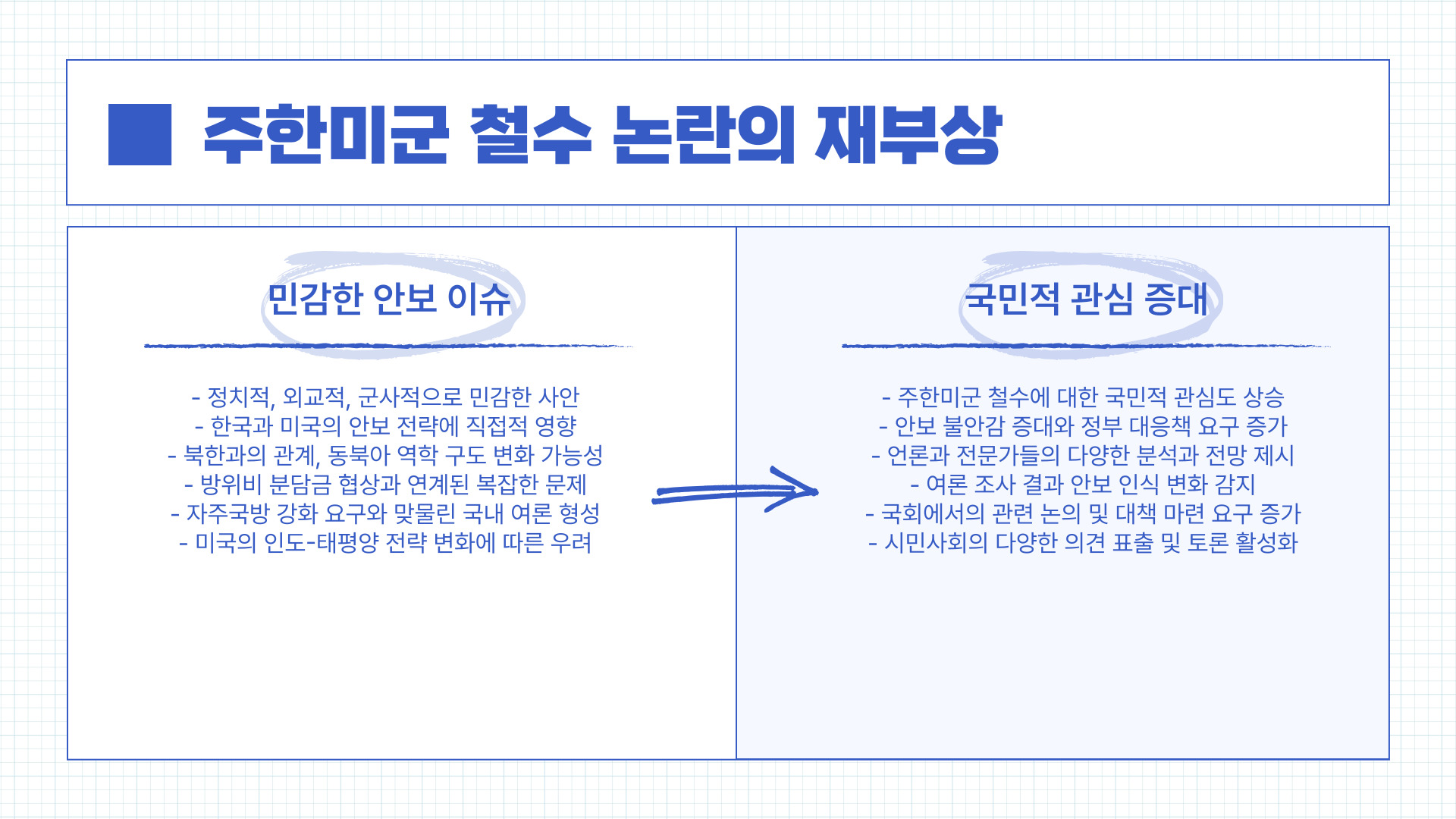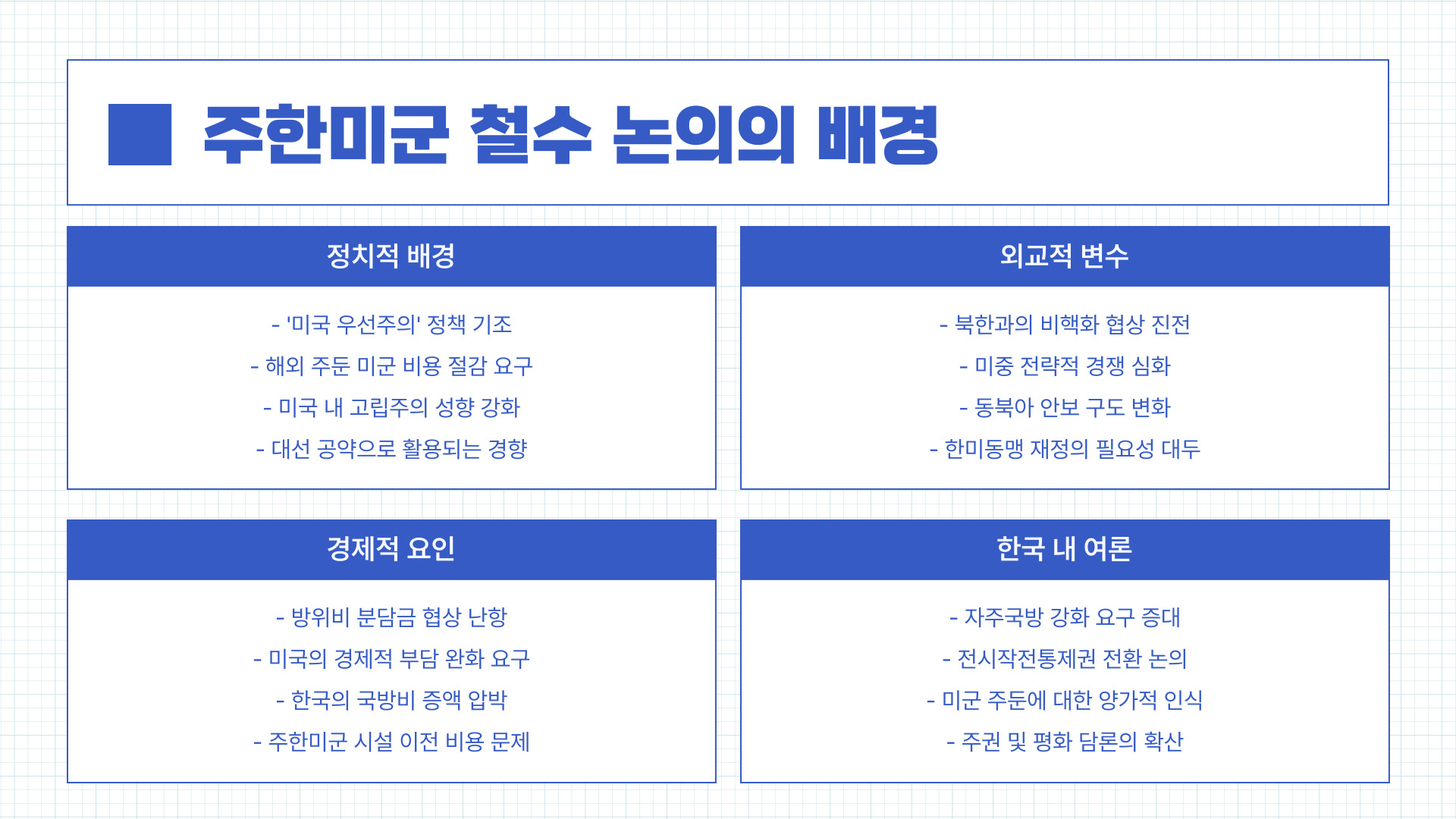 - 2024년 12월: 미국 대선 이후 일부 정치권에서 철수론 재점화