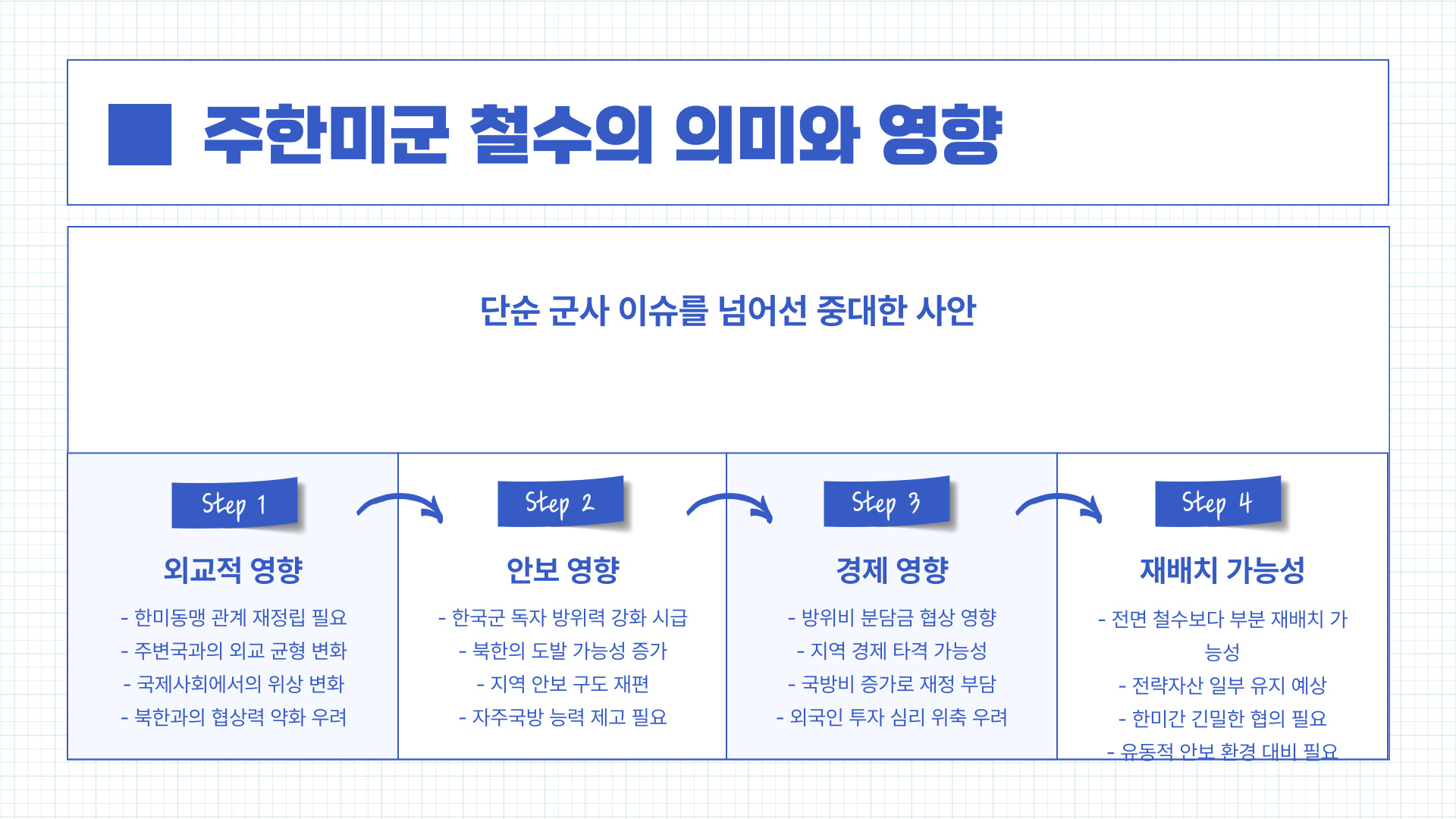 이러한 흐름 속에서 한국은 자주국방 강화, 미군과의 협력, 외교 다변화 등을 통해 철수 가능성에 대비해야 합니다.