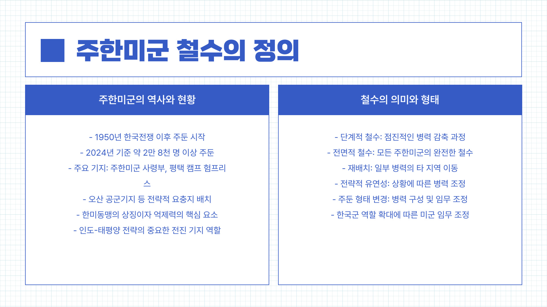 주한미군은 1950년 한국전쟁 이후 한반도 안보를 위해 주둔해온 미국의 군사력입니다. 2024년 기준으로 약 2만 8천 명 이상의 미군이 주한미군 사령부, 평택의 캠프 험프리스, 오산 공군기지 등에 배치되어 있습니다. "주한미군 철수"란 이 병력을 단계적이거나 전면적으로 철수하는 정책적 결정을 말합니다.