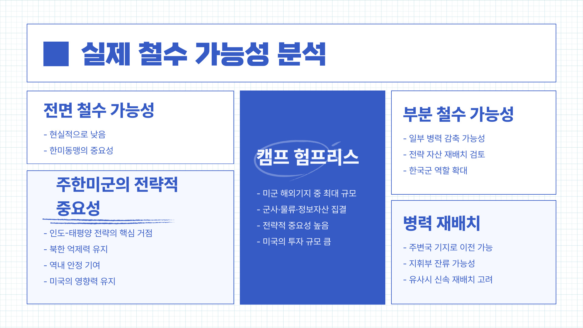 다만 부분 철수 또는 병력 재배치는 현실 가능한 시나리오입니다. 예를 들어 공군 자산은 괌이나 일본으로 이전하면서도 지휘부는 한국에 남겨둘 수 있습니다.
